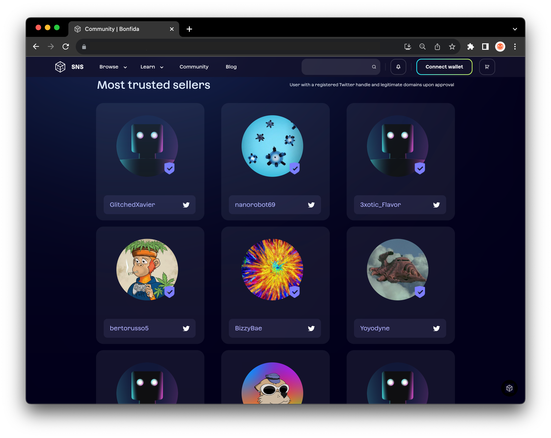 상단 메뉴에서 Community → Certified sellers를 선택하면 판매자별로 등록된 도메인을 확인할 수 있습니다.