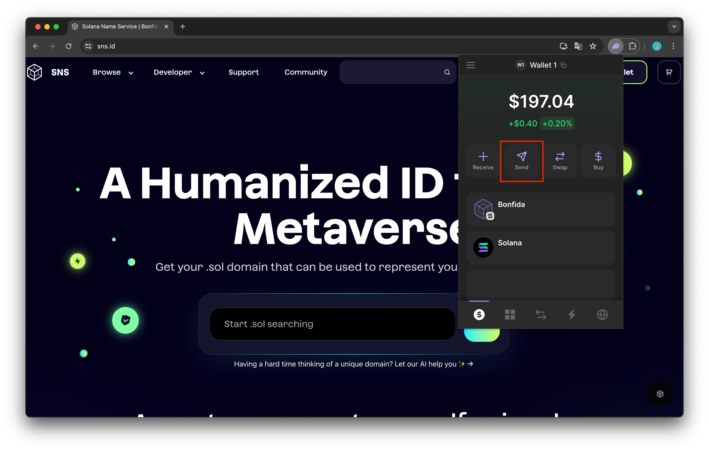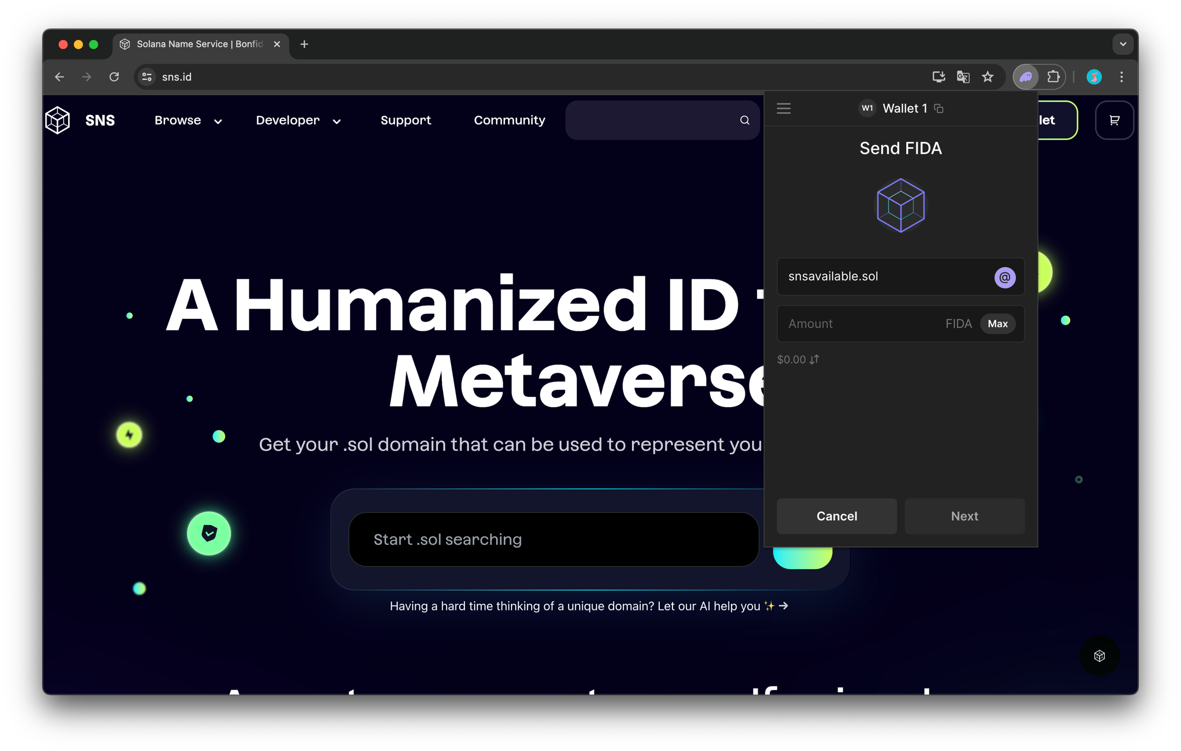 SNS를 통해 SPL 토큰과 SOL을 주소 대신 .sol 도메인 또는 트위터 핸들로 직접 전송할 수 있습니다.