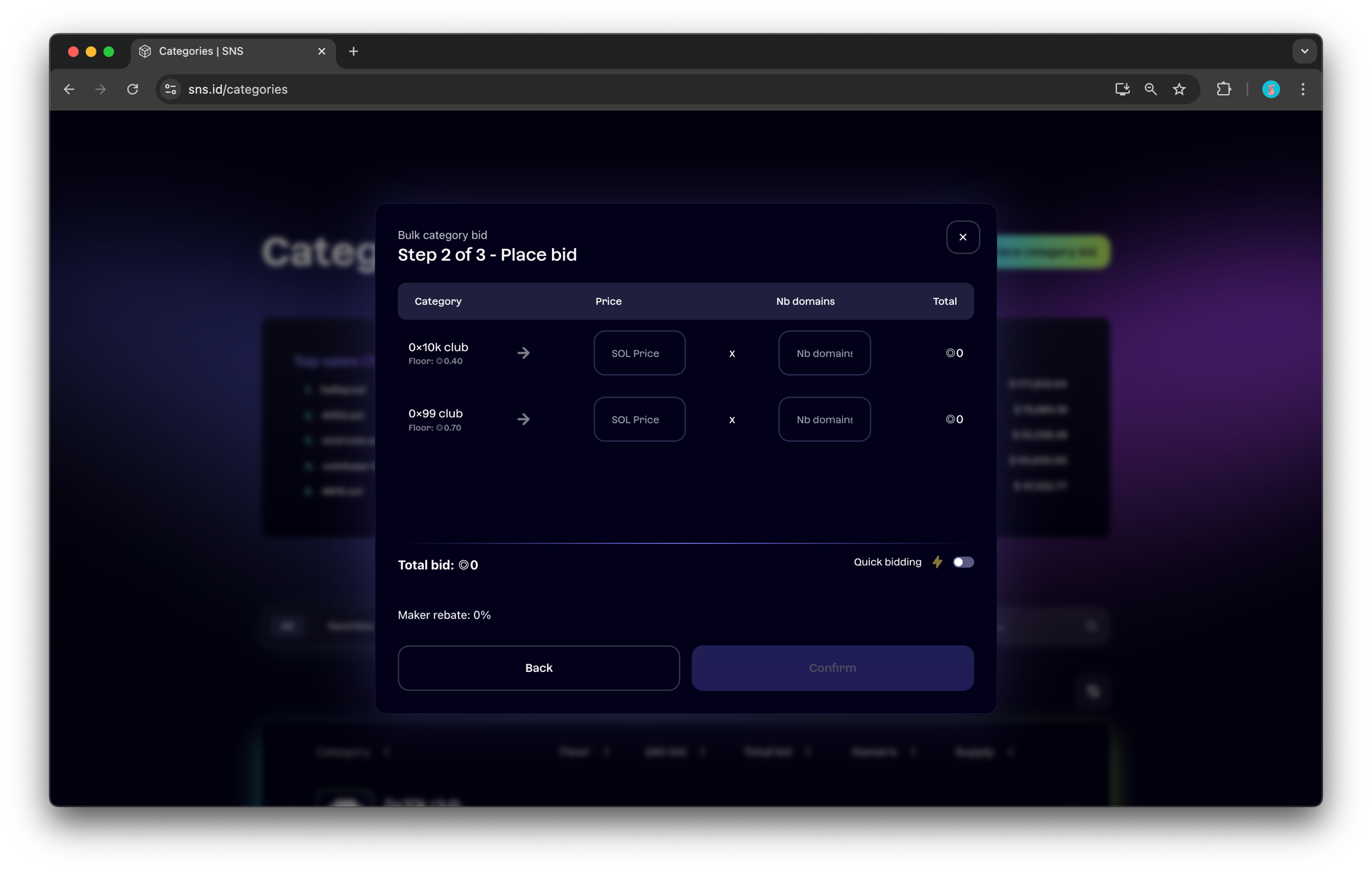 입찰하려는 카테고리를 선택하고 도메인 1개당 지불할 SOL 금액과 사고 싶은 도메인 수량을 입력합니다.