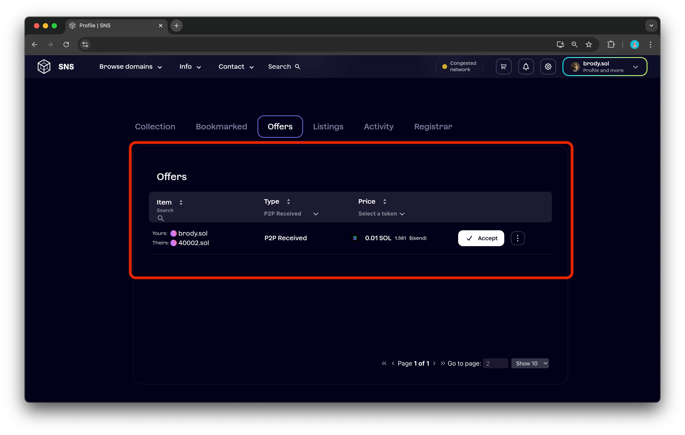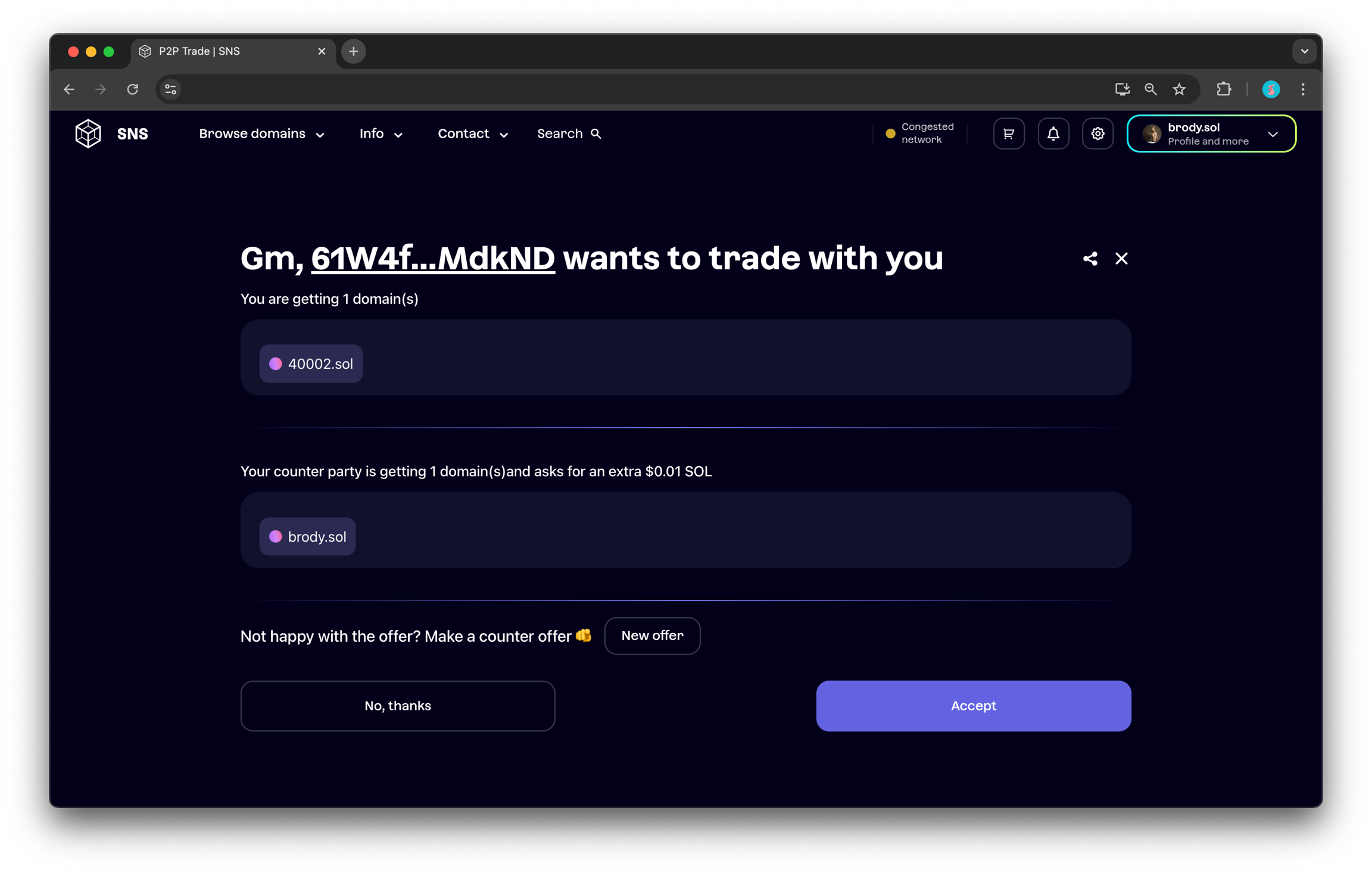 P2P 거래를 시작하면 도메인(및 추가된 SOL)은 에스크로로 이동합니다. 거래를 취소하면 도메인과 서비스 수수료는 다시 지갑으로 반환됩니다.