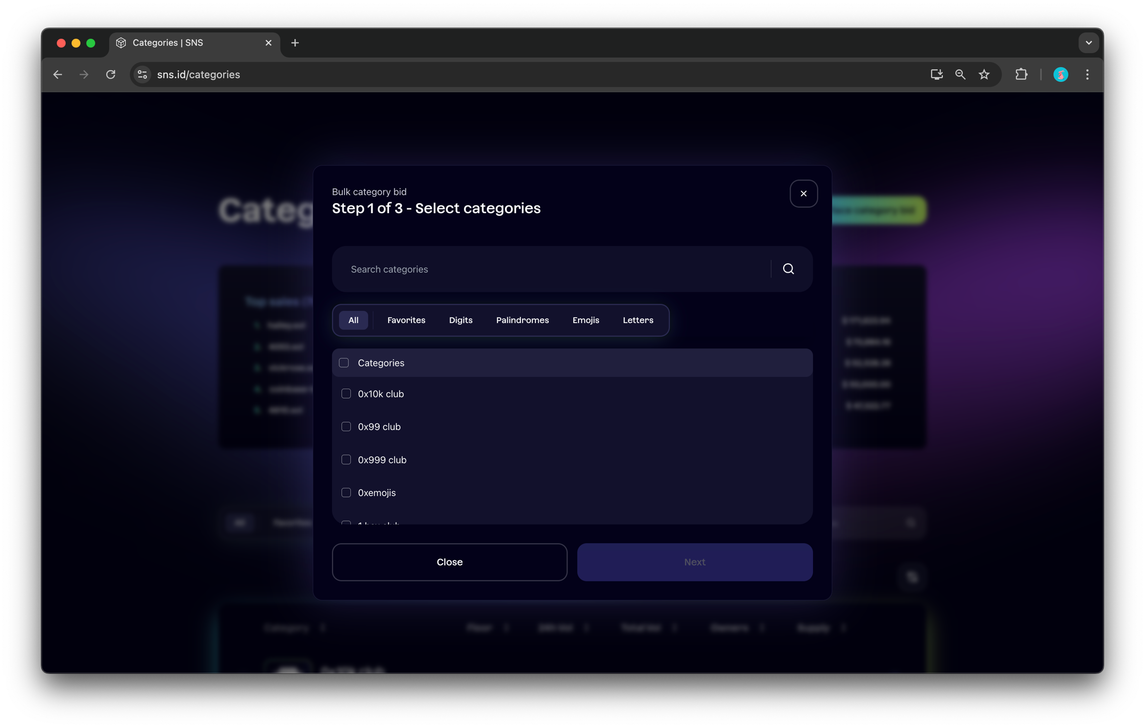 “Browse domains” → “Categories”로 이동하면 “Place category bid” 버튼이 있습니다.