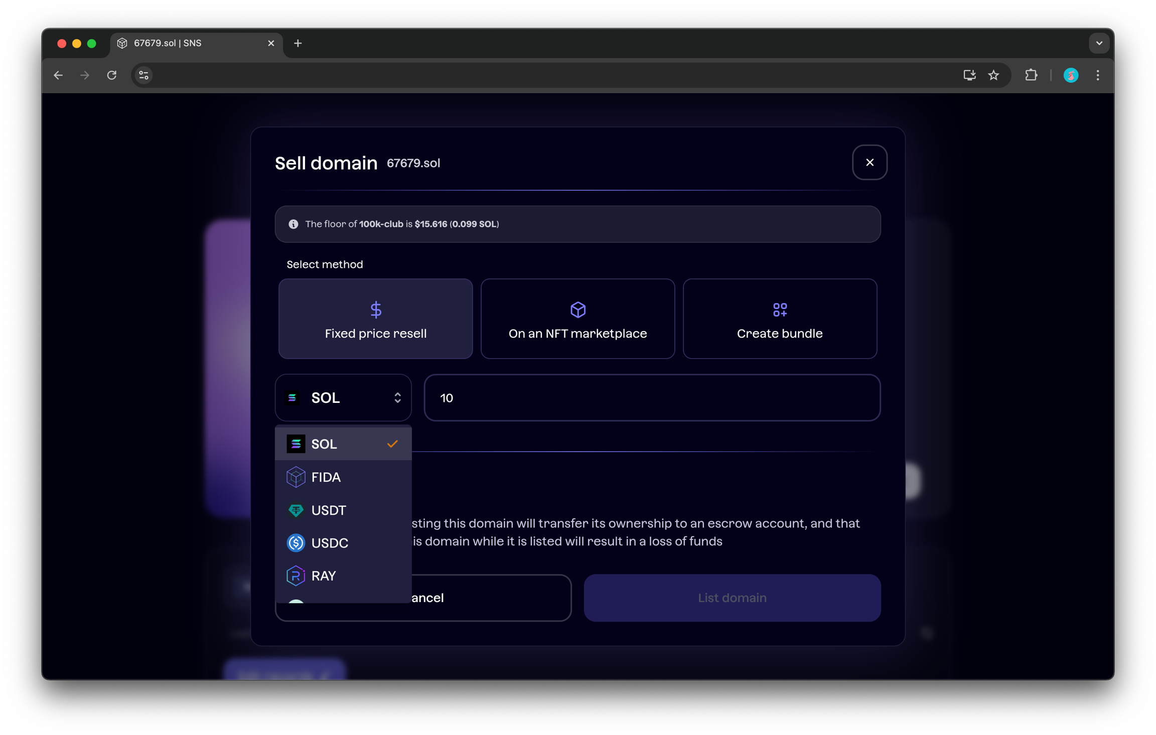 도메인이 표시된 통화를 보유하고 있으며, 거래 수수료를 위한 SOL도 준비해야 합니다.