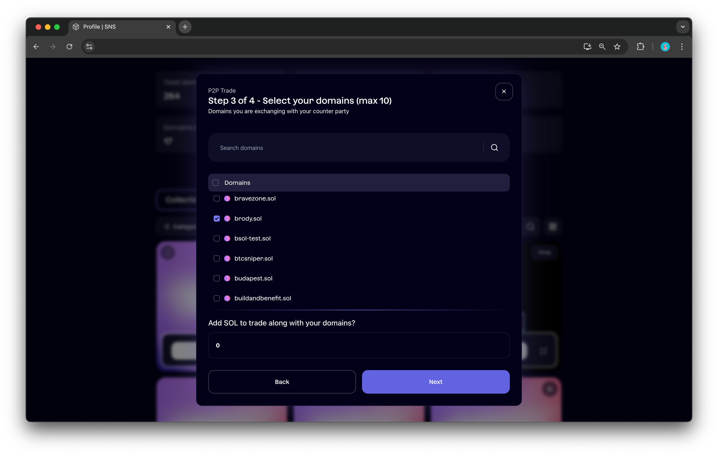 다음으로 상대방에게서 받고 싶은 도메인을 선택합니다. 단순히 도메인만 교환하거나 SOL을 추가한 교환도 가능합니다. 예시에서는 🍑x.sol과 0.01 SOL을 받고 싶다고 가정합니다. 그 후 본인이 제공할 도메인(또는 SOL)을 선택합니다.