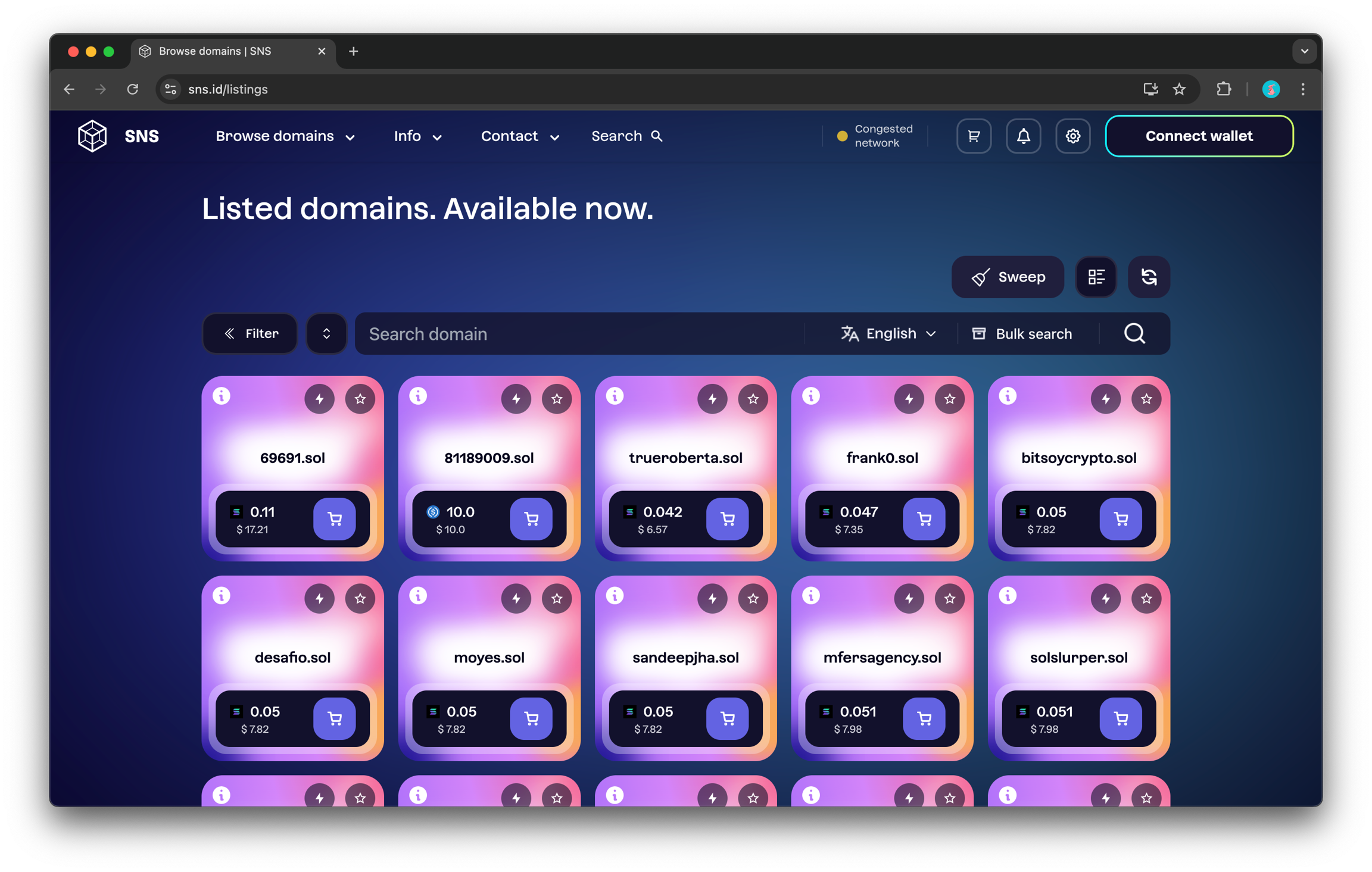 고정가로 도메인을 구매하려면 “Browse domains”에 들어가 “Listed domains”를 선택하세요. 필터를 사용하거나 직접 탐색하여 원하는 도메인을 찾을 수 있습니다.