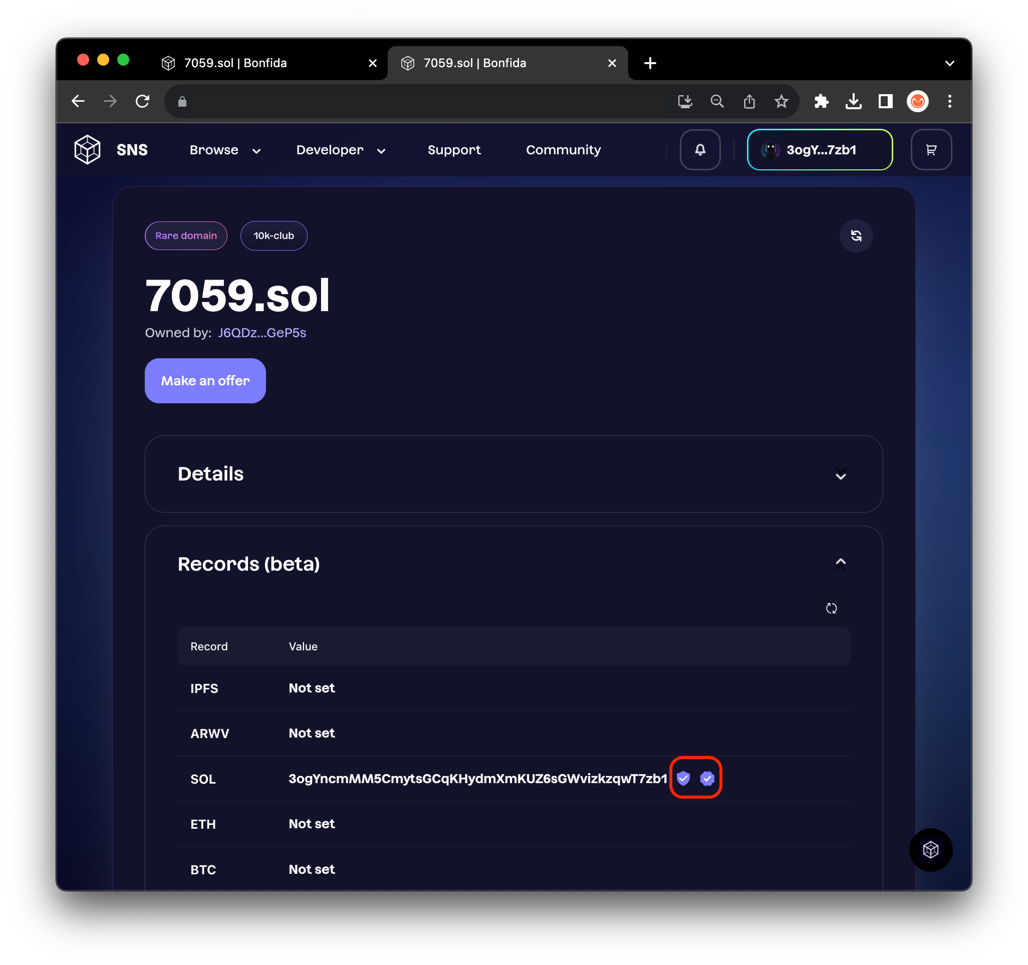 그 다음, “검증(verify)” 버튼이 보입니다. 이 버튼은 SOL 레코드에 입력된 주소(핫 월렛)로 접속했을 때만 표시됩니다. 해당 주소로 서명하면 두 개의 배지가 모두 검증 완료됩니다.