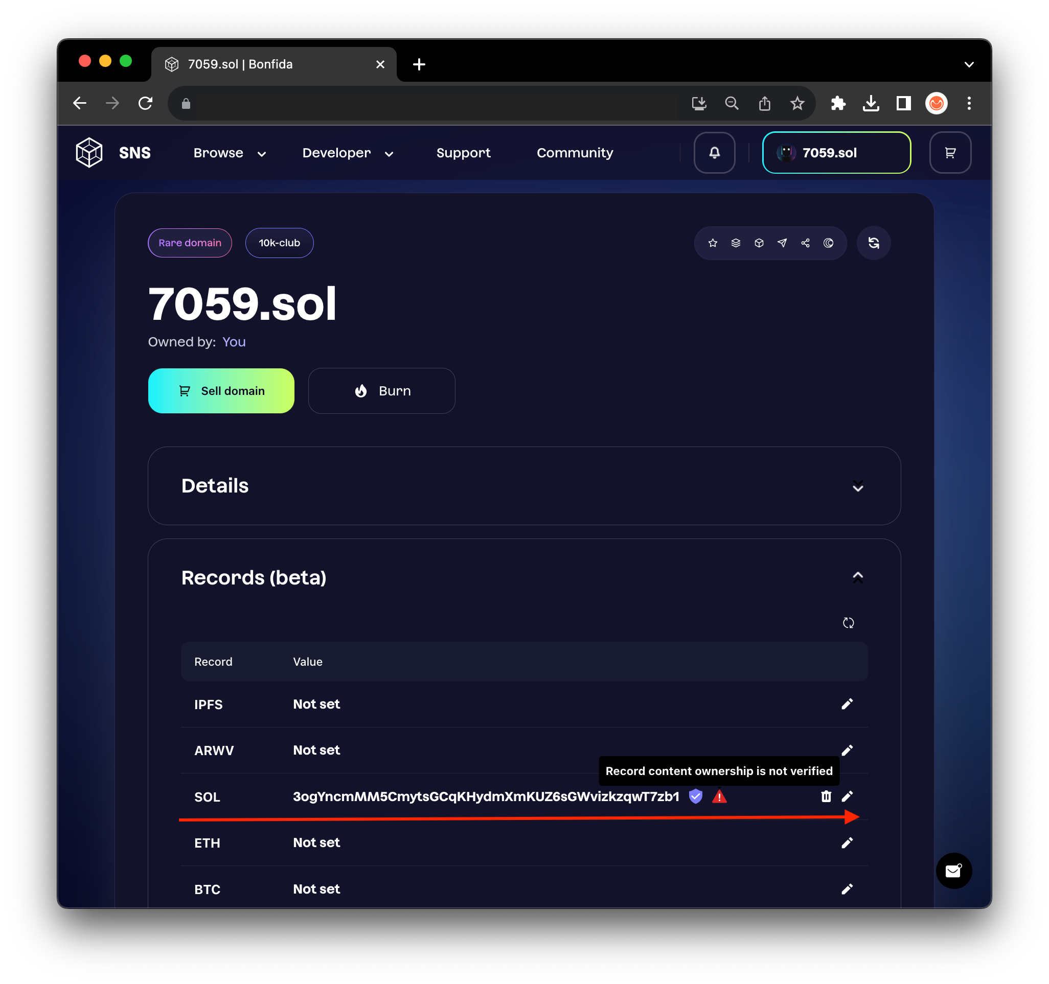 연관성 인증(RoA)을 통해 사칭을 방지합니다. 예를 들어 ETH 레코드의 경우, .sol 도메인 소유자가 해당 ETH 주소의 실제 소유자인지 확인합니다.