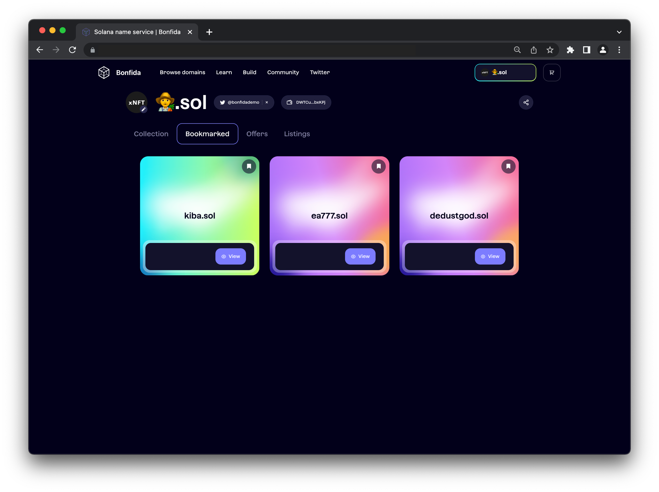 북마크 아이콘을 클릭하면 하얗게 변하며, 이는 도메인이 저장되었음을 의미합니다. 저장된 도메인은 프로필 페이지의 “Bookmarked” 섹션에서 확인할 수 있습니다.