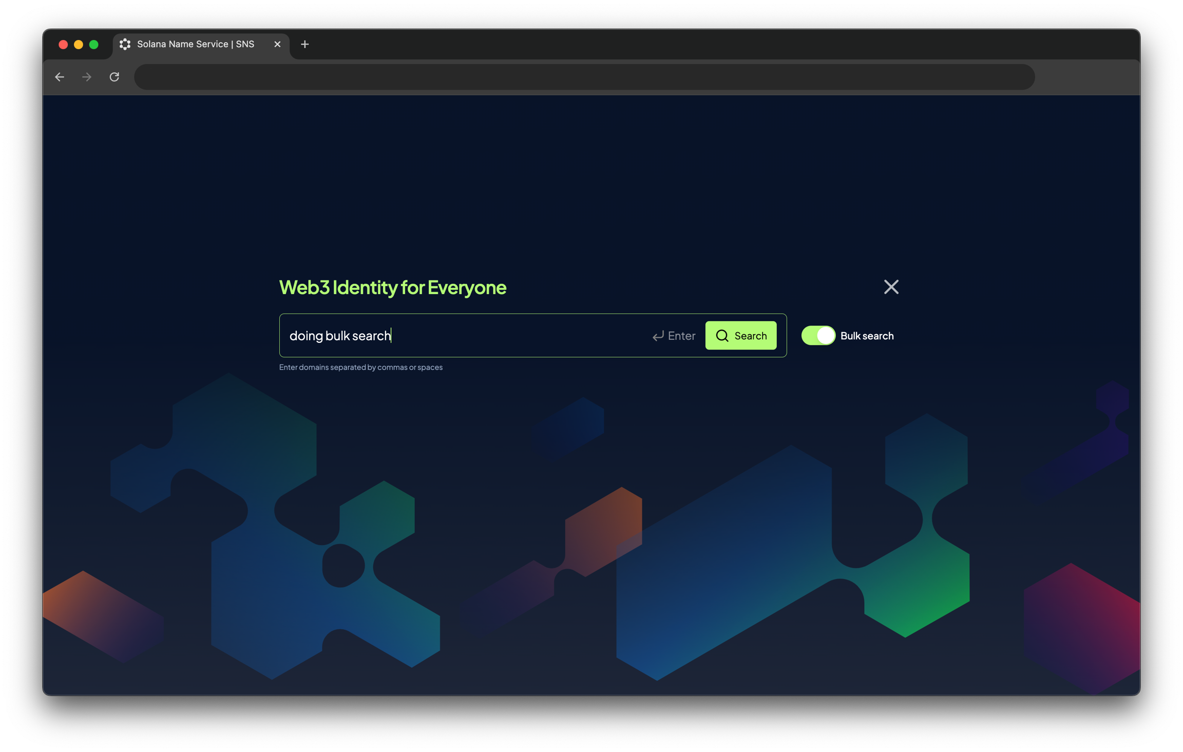 브라우저의 검색 섹션에는 Bulk Search(대량 검색) 토글 기능도 있습니다. 이 기능을 사용하면 여러 도메인을 동시에 검색할 수 있으며, 도메인 이름은 쉼표(,) 또는 공백으로 구분할 수 있습니다.