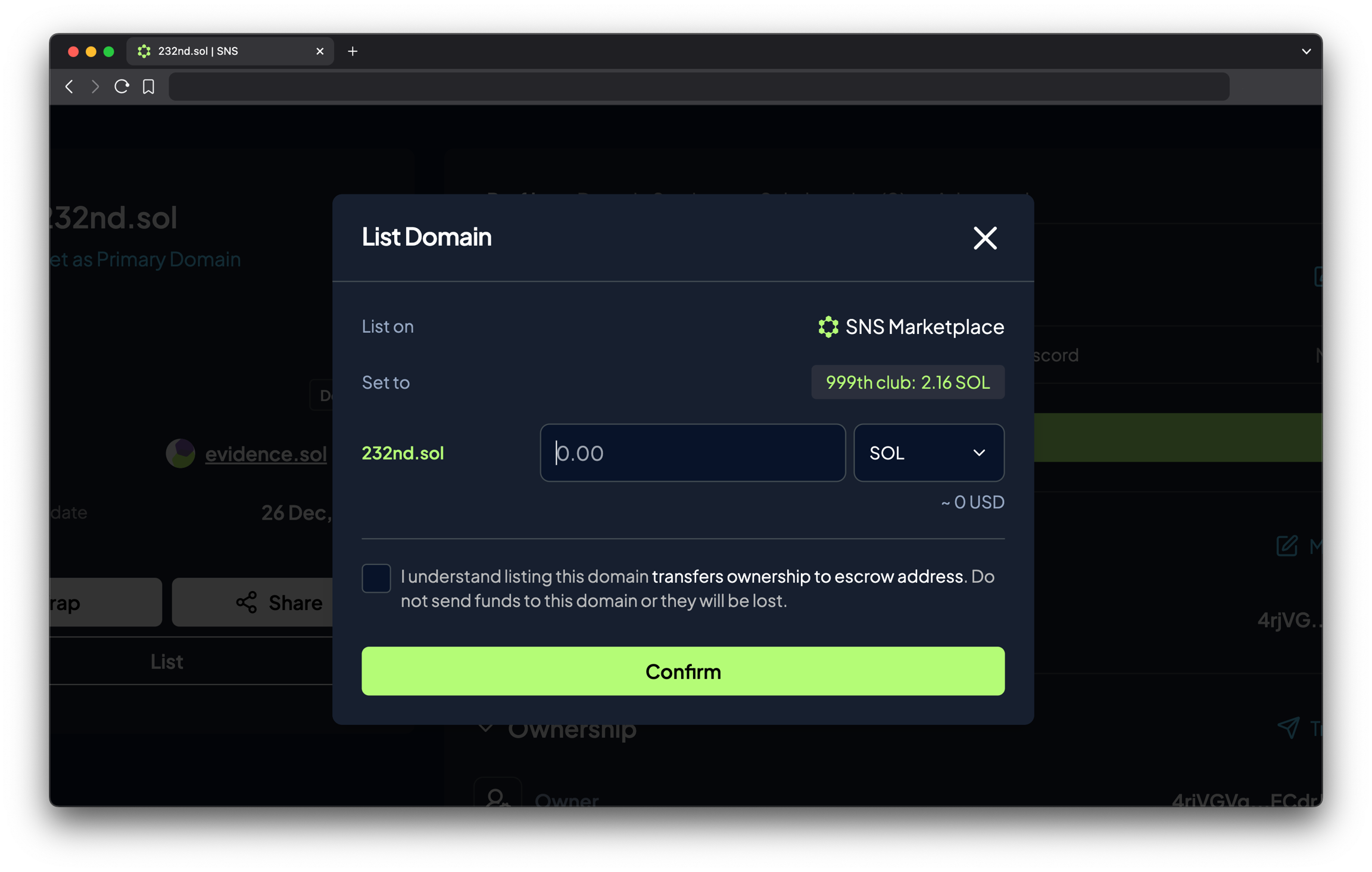 오른쪽 상단의 프로필 페이지로 이동하세요. 아직 지갑을 연결하지 않았다면 먼저 지갑을 연결해야 합니다. 판매하고자 하는 도메인을 선택한 뒤 List 버튼을 클릭합니다. 그다음, 판매할 통화와 가격을 입력하고 Confirm을 눌러 목록에 등록하세요.