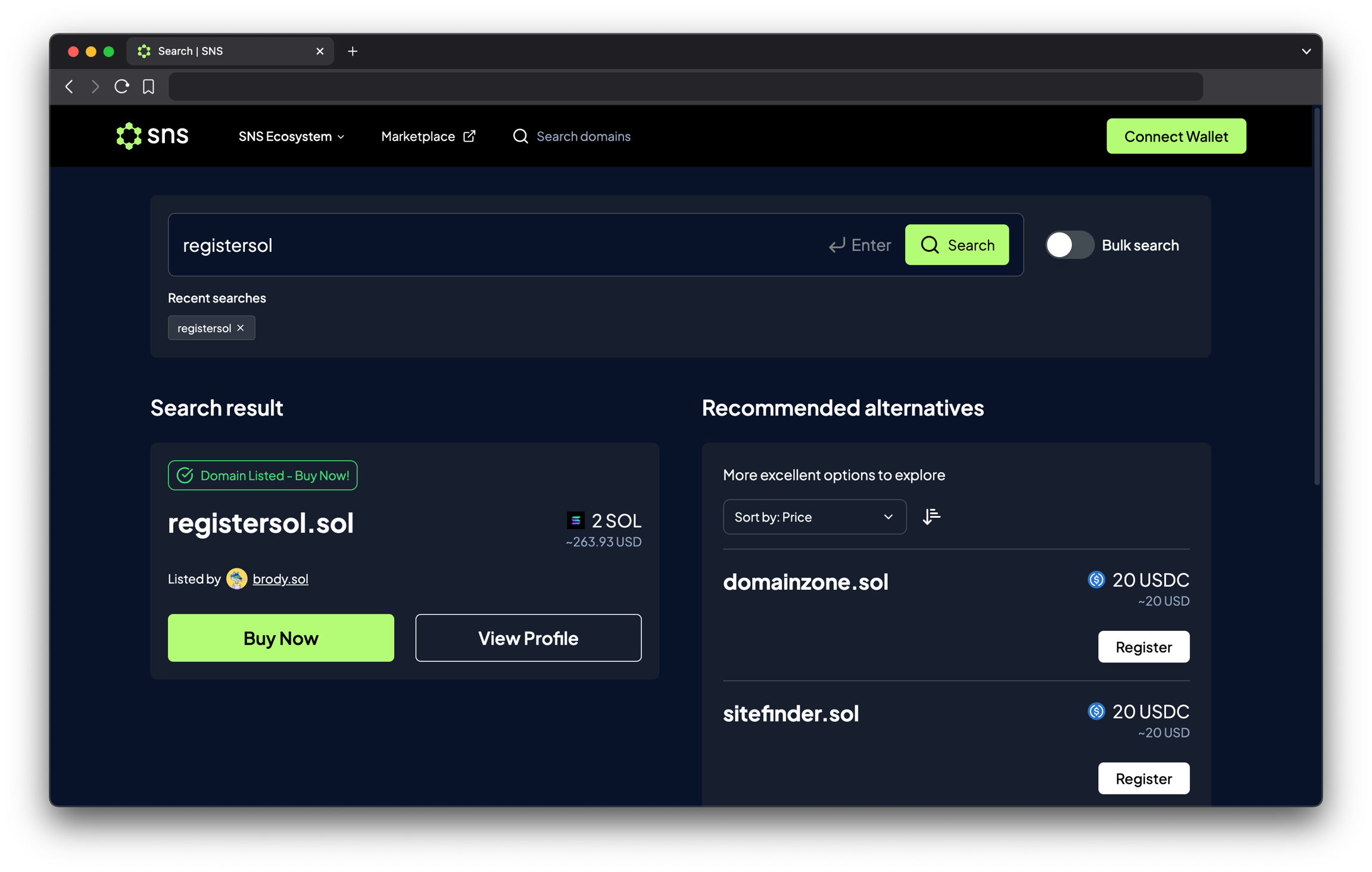 sns.id에서 .sol 도메인을 검색할 때, 이미 등록된 도메인을 발견할 수도 있습니다.