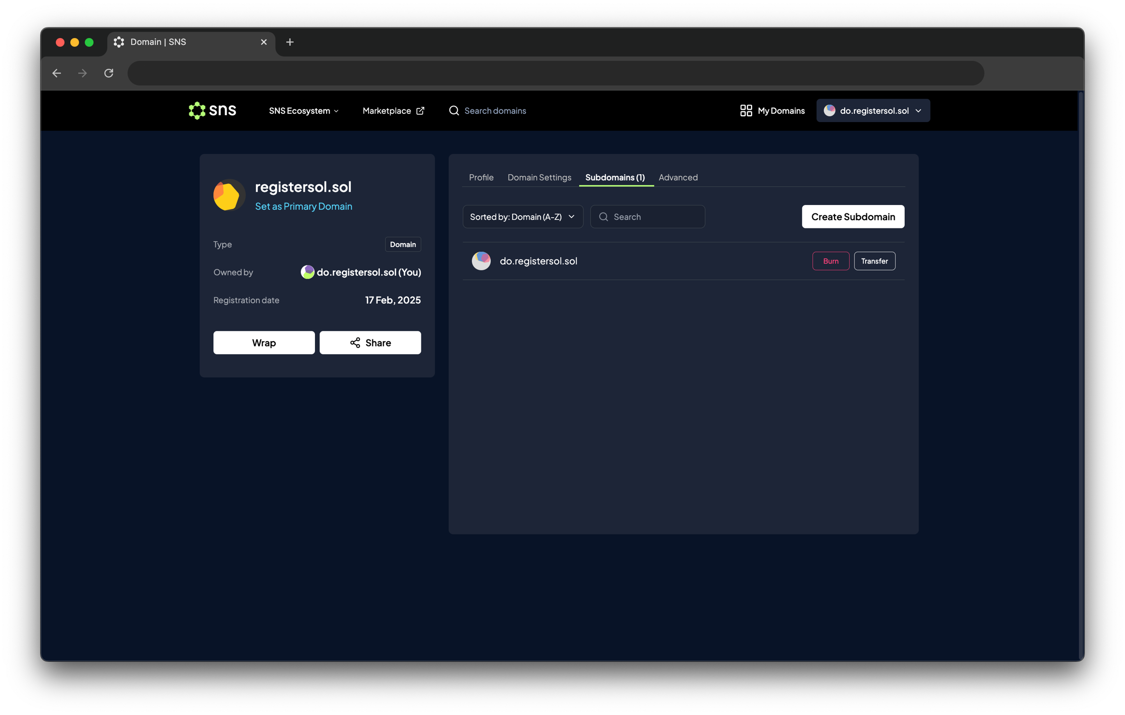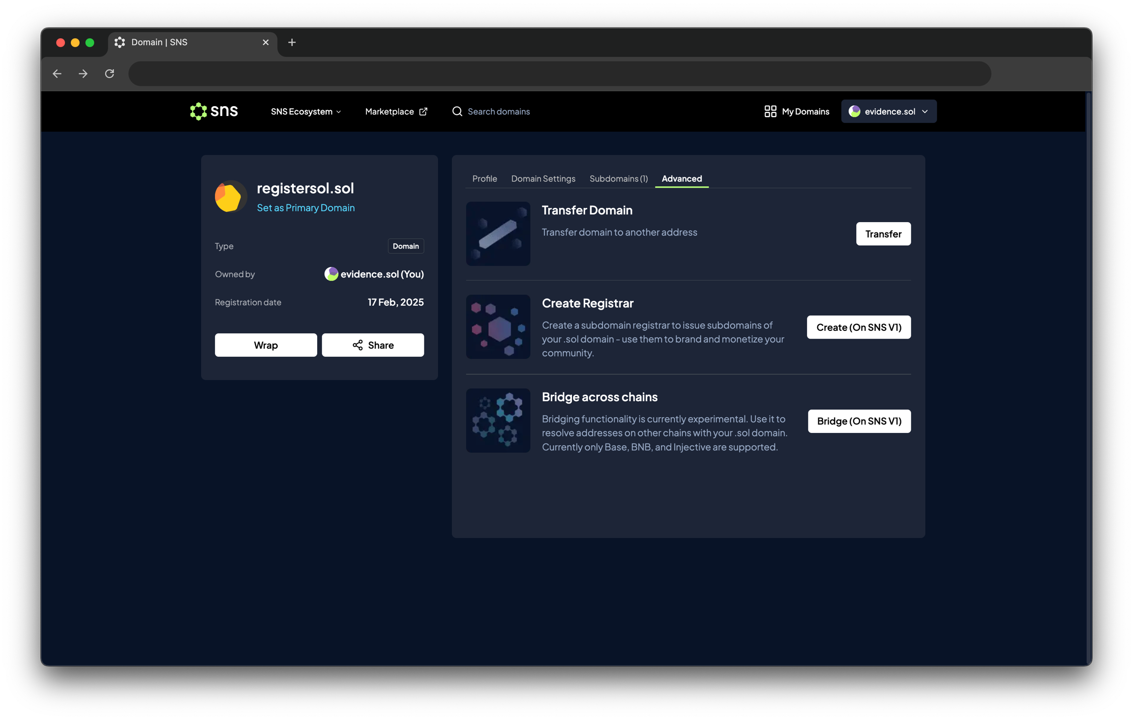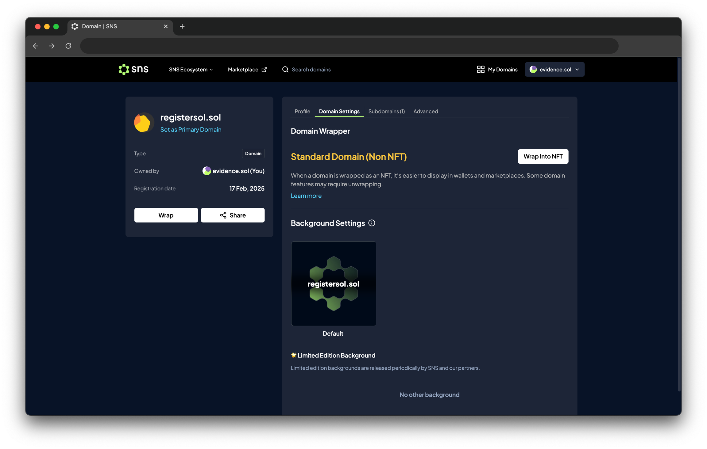이 기능은 주로 NFT 마켓플레이스에서 도메인을 거래할 때 사용됩니다. 원하는 도메인을 열고 Domain Settings에서 Wrap into NFT 버튼을 클릭한 후 거래를 승인하세요. 래핑된 도메인은 프로필 페이지의 NFTs 탭에서 확인할 수 있습니다.