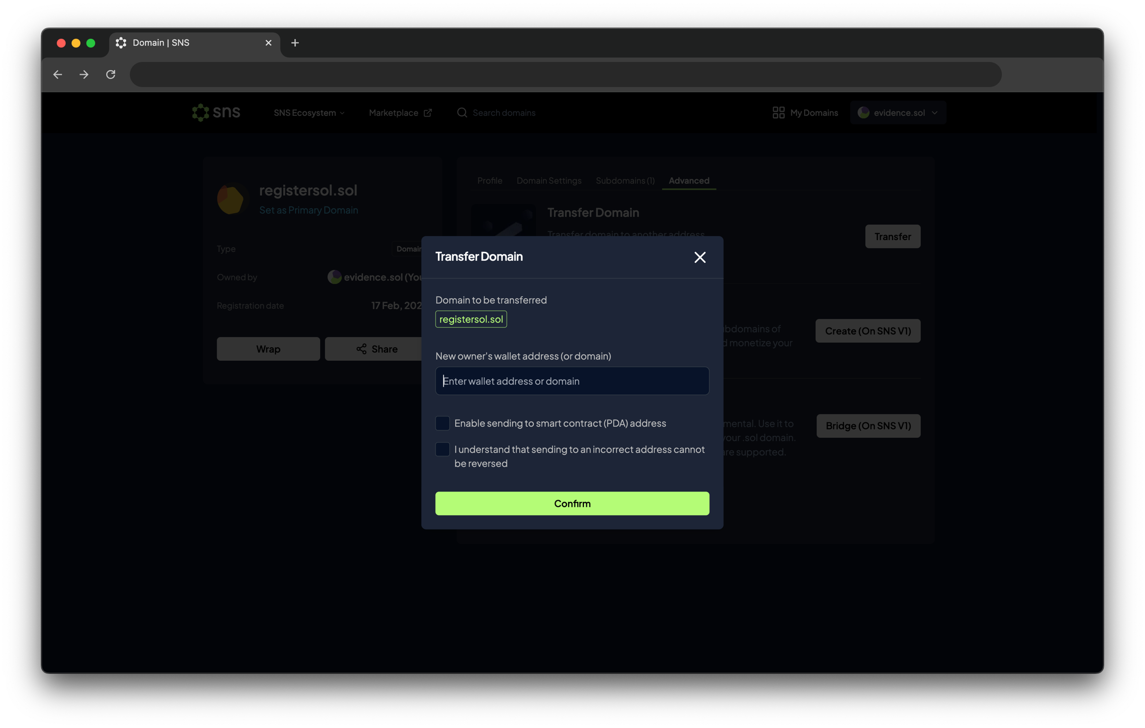 도메인 상세 페이지의 Advanced 섹션을 열고, Transfer를 클릭한 후 이전할 지갑 주소(또는 .sol 도메인 주소)를 입력하세요.