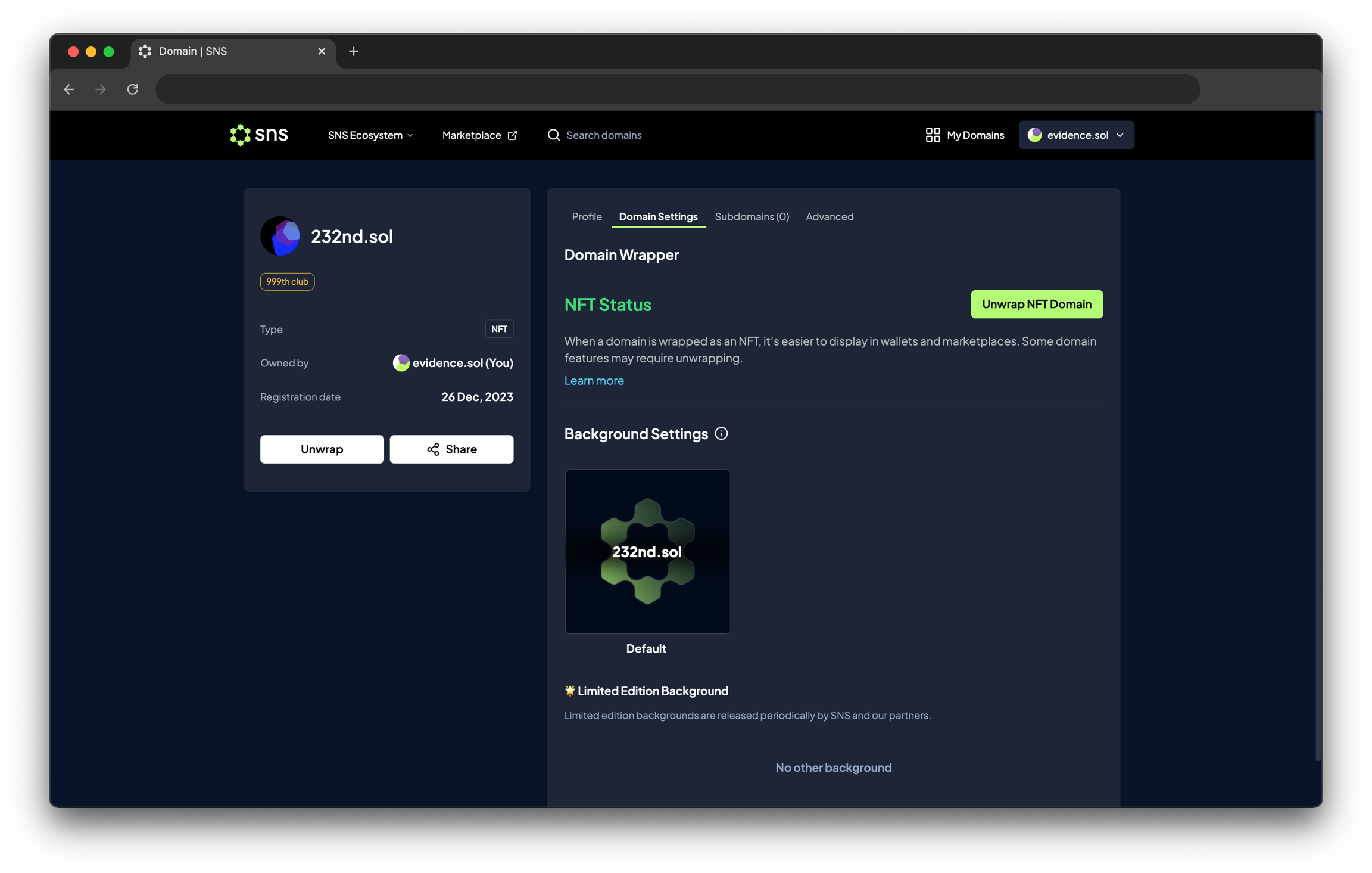 동일한 페이지에서 Unwrap NFT Domain 버튼을 클릭하여 언제든지 도메인을 언래핑할 수 있습니다.
