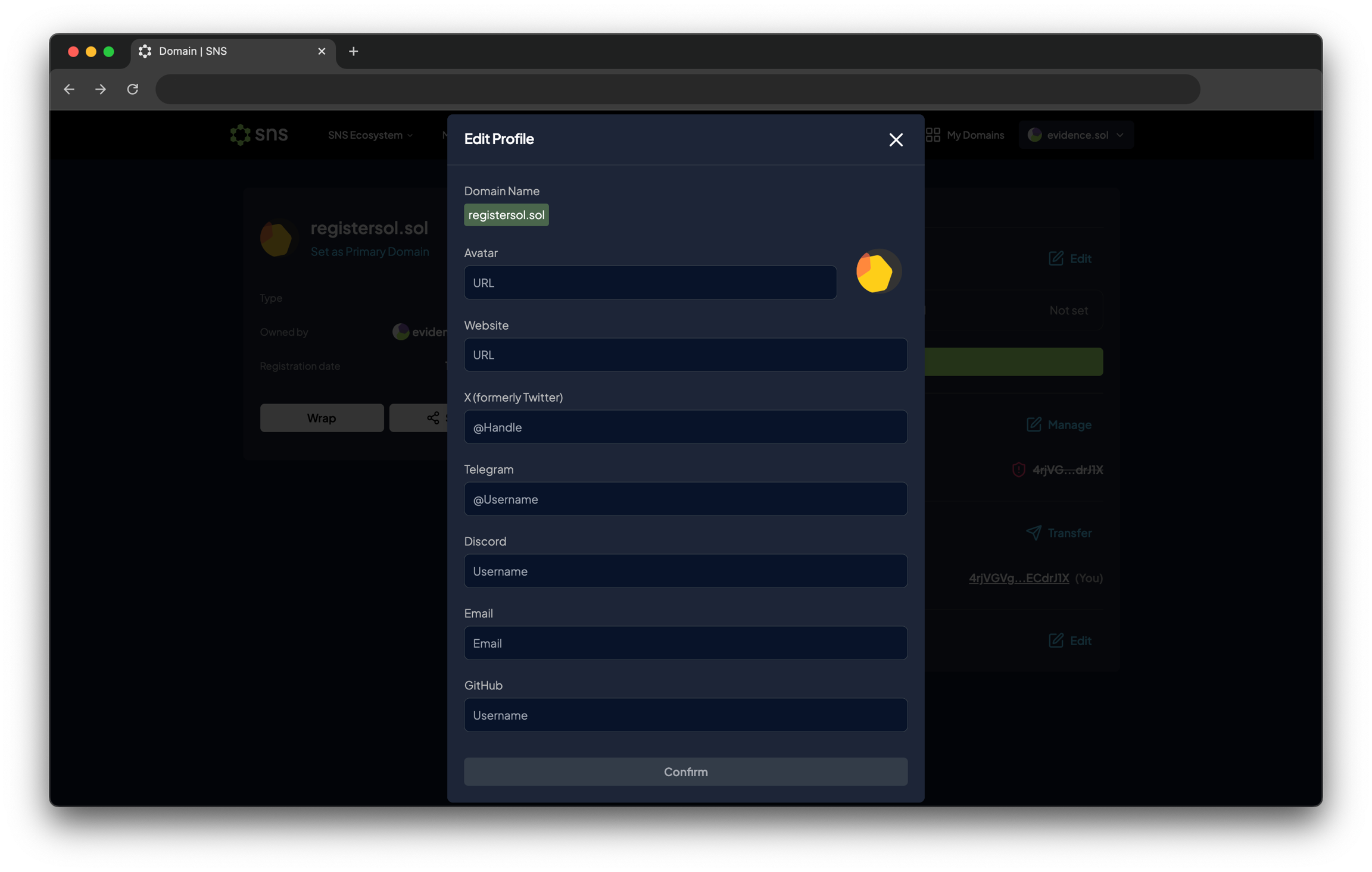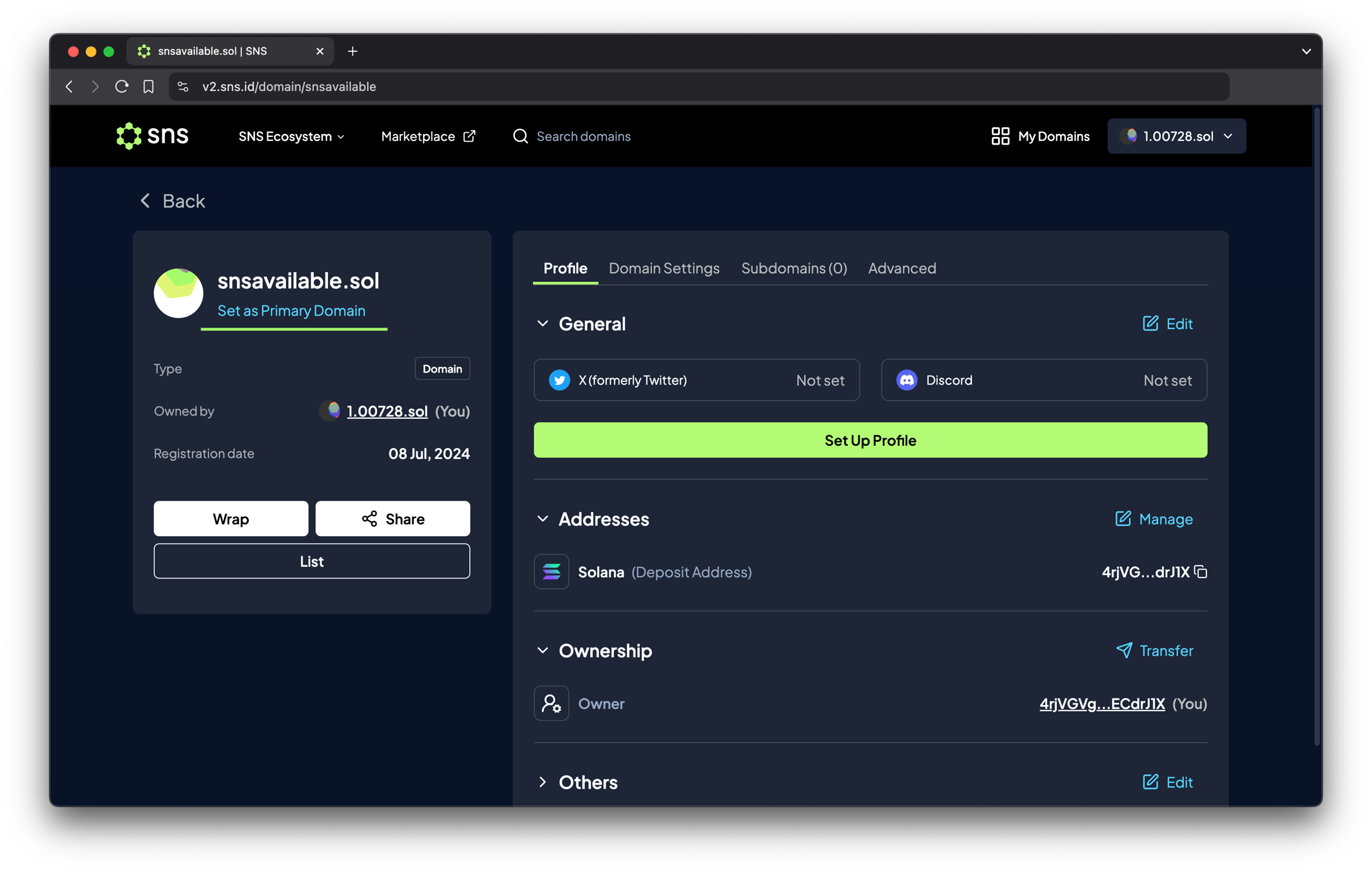 특정 .sol 도메인의 소유자로서 자신에 대한 추가 정보를 제공하려면 sns.id에 접속해 수정하려는 도메인을 선택하고 Set Up Profile 버튼을 클릭하세요.