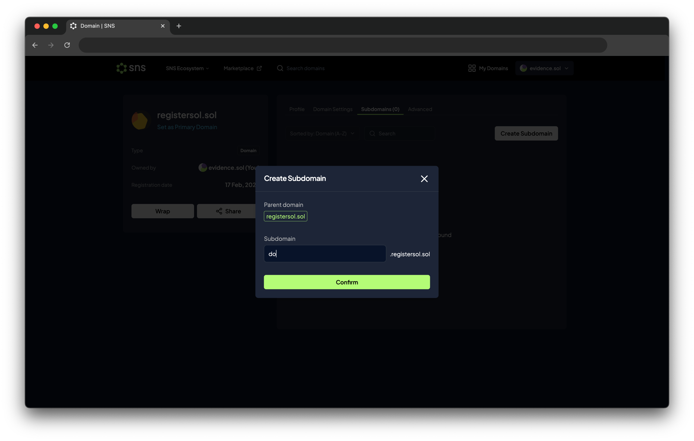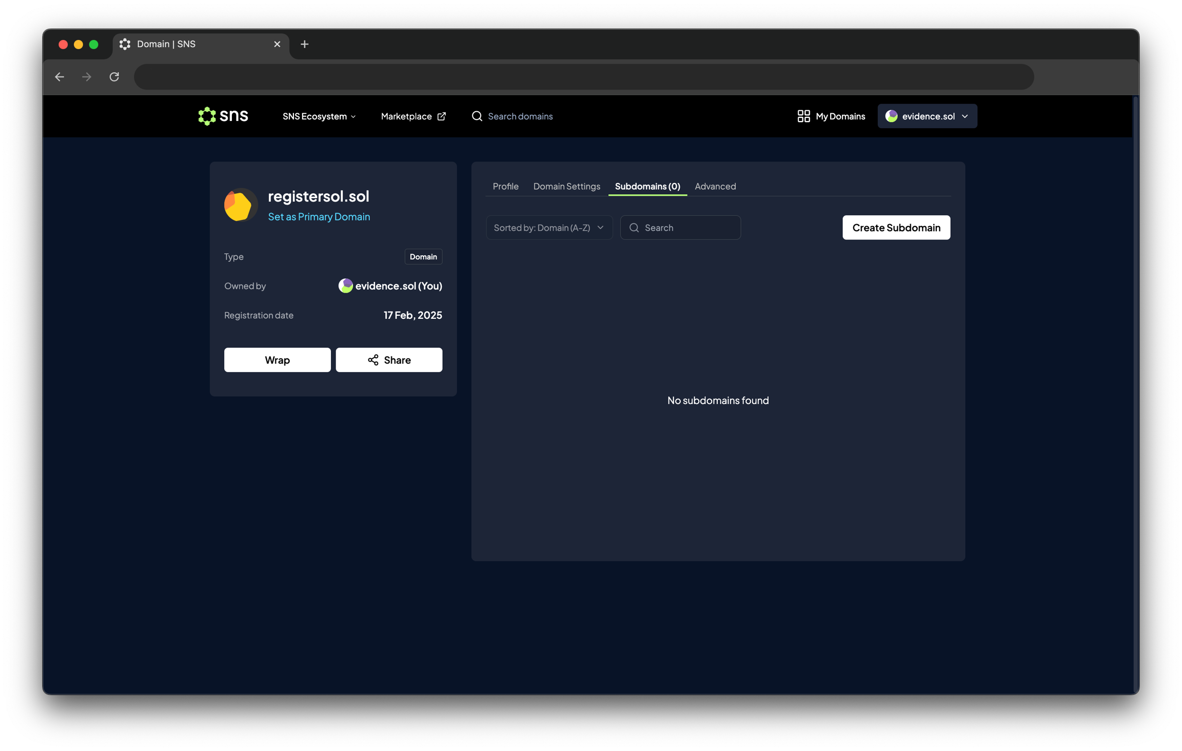Confirm을 클릭하고 지갑에서 거래를 승인하면, 생성된 서브도메인이 도메인 상세의 Subdomains 섹션에 표시됩니다.