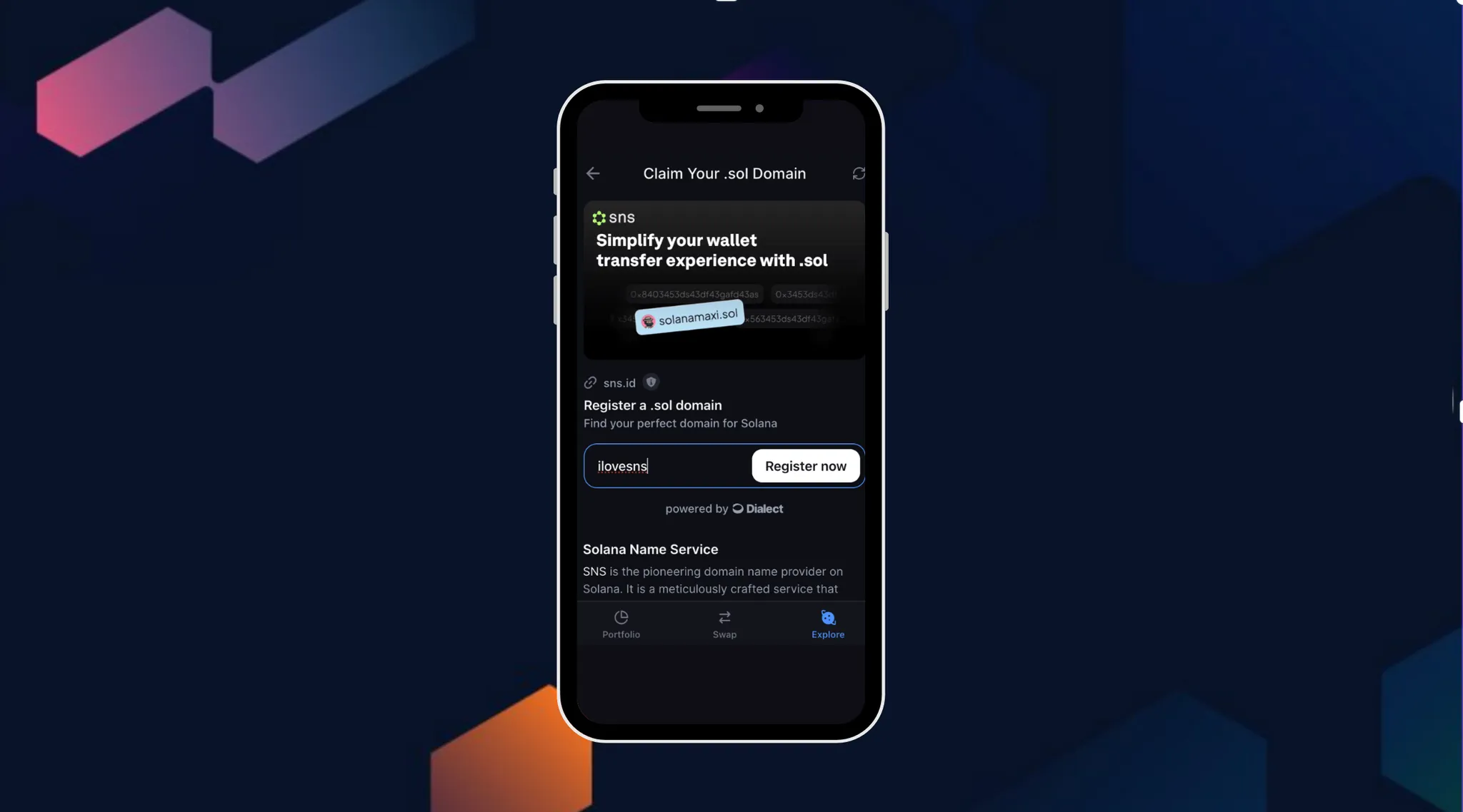 Explore 탭으로 이동 → 검색창에 등록할 .sol 도메인 입력