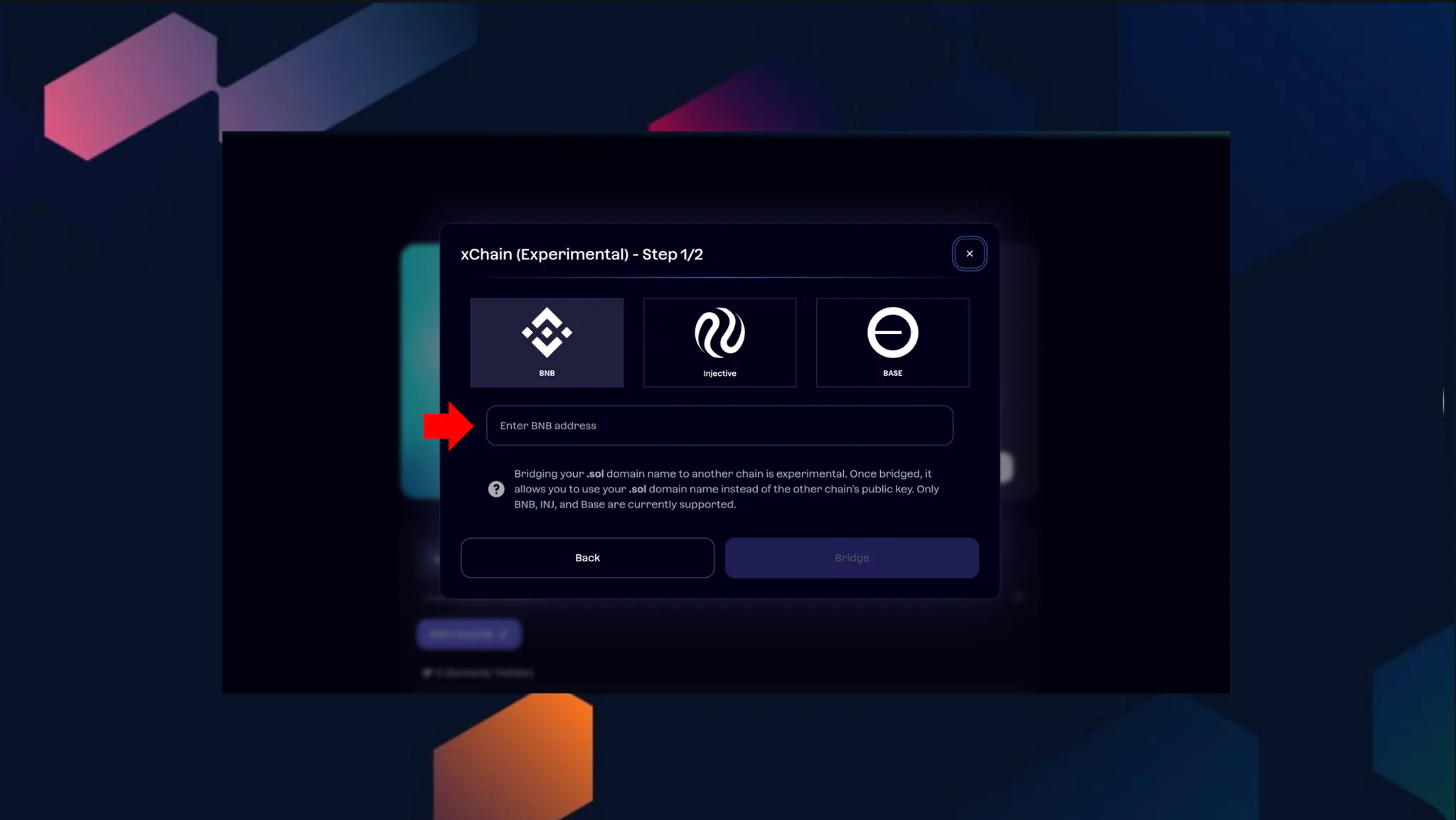 BNB, Injective, 또는 Base 주소를 입력한 뒤 Bridge 버튼을 클릭하세요.