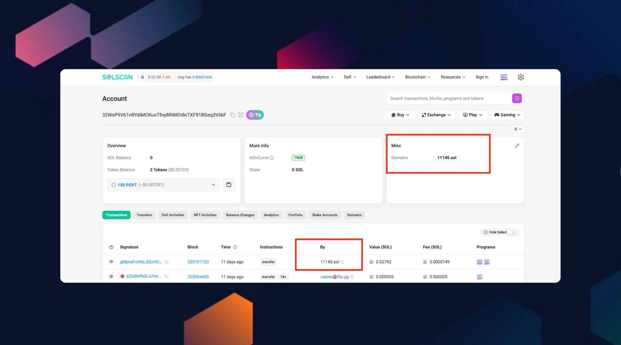 여러 Solana 블록체인 탐색기에서 .sol 도메인과 연결된 모든 거래를 쉽게 조회할 수 있습니다.