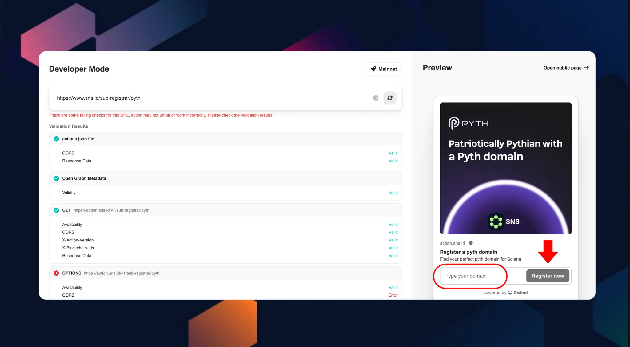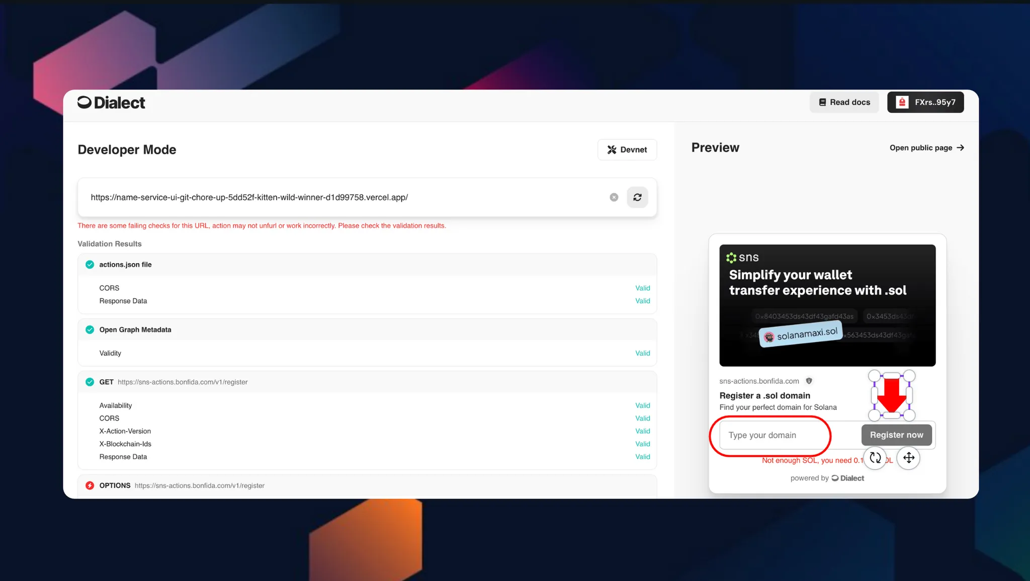 Dialect SNS Blink Page 에서 .sol 도메인을 등록하고 지시에 따라 진행합니다.