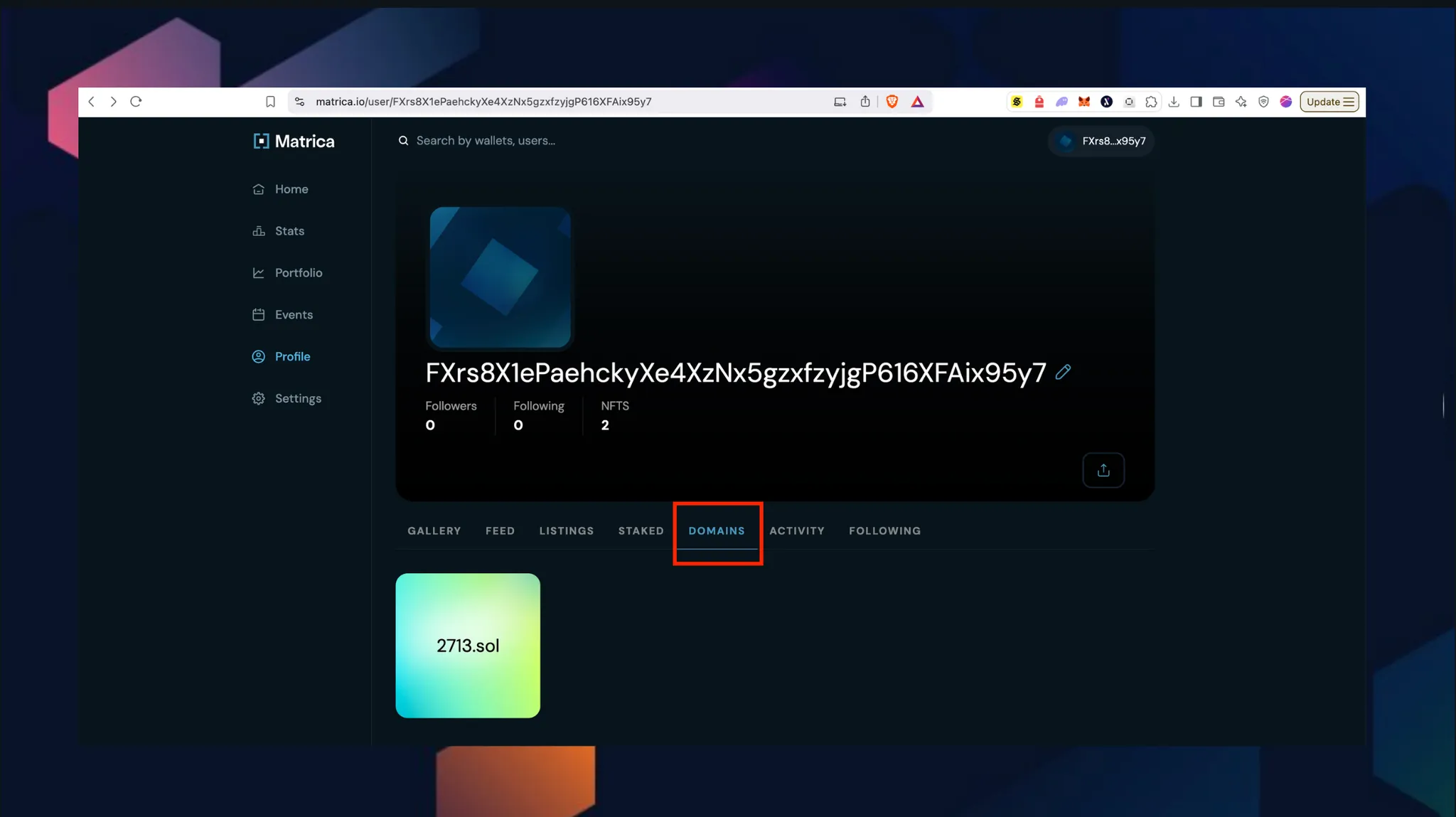 Matrica 프로필의 Domains 탭에서 자신의 .sol 도메인을 확인할 수 있습니다.