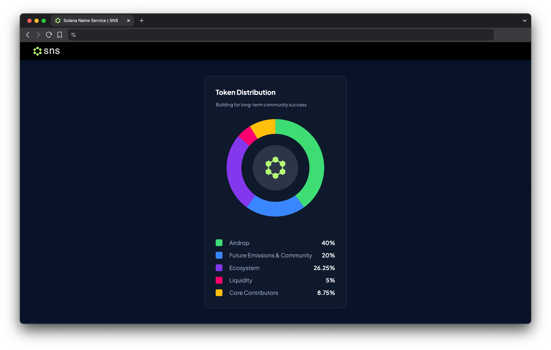 • 전체 공급량의 **40%**는 기존 .sol 도메인 보유자, Solana 커뮤니티, 파트너, 그리고 SNS 사용자들이 청구할 수 있습니다.